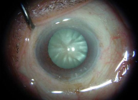 (1)初发期(incipient stage):晶状体皮质内出现空泡、水裂和板层分离。空泡为圆形透明小泡,位于前后皮质中央部或晶状体缝附近。水裂的形态不一,从周边向中央逐渐扩大。板层分离多在皮质深层,呈羽毛状。楔形混浊常见,位于前后皮质,尖端向着晶状体中心,基底位于赤道部。这些混浊在赤道部汇合,形成轮幅状,或在某一象限融合成片状混浊。散瞳后,应用检眼镜彻照法,可在眼底红光反射中看到轮幅状混浊的阴影。此时瞳孔区的晶状体未累及,一般不影响视力。晶状体混浊发展缓慢。可经数年才进入下一期。