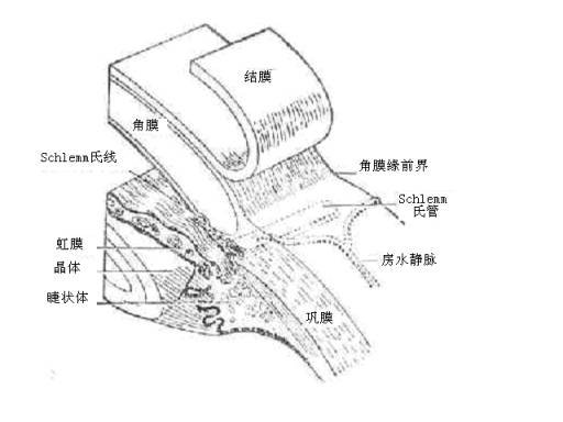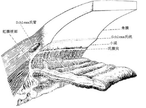 3.角膜缘和前房角:角膜缘(limbus):是指从透明的角膜到不透明的巩膜之间灰白色的连接区,平均宽约1mm,角膜前弹力层的止端是球结膜的附着缘,后弹力层的止端是小梁网组织的前附着缘。在切面上,此两缘的联线就是角、巩膜的分界线,此区内角膜嵌入膜,在内外表面分别形成巩膜内沟和外沟。 前房角(angle of anterior chamber ):位于前房的边缘部内。由角膜缘、睫状体及虹膜根部围绕而成,其前壁为角膜缘,后膜为虹膜根部,两壁在睫状体前面相遇,构成房角隐窝。(1)前房角前壁的前界线称Schwalbe 线,在前房角镜下呈一条灰白色发亮略成突起的线,为角膜后弹力层的终止部。(2)巩膜突,是巩膜内沟的后缘,向前房突起,为睫状肌纵行纤维的附着部。(3)巩膜静脉窦,即Schlemm管,是一个围绕前房角一周的环行管。位于巩膜突稍前的巩膜内沟中,表面由小梁网所复盖,向外通过巩膜内静脉网或直接经房水静脉将房水运出球外,向内与前房交通。(4)小梁网(trabecular meshwork),为位于巩膜静脉窦内侧、Schwalbe 线和巩膜突之间的结构。房角镜下是一条宽约0.5mm的浅灰色透明带,随年龄增加呈黄色或棕色,常附有色素颗粒,是房水排出的主要区域。组织学上是以胶原纤维为核心、围以弹力纤维及玻璃样物质,最外层是内皮细胞。(5)前房角后壁,为虹膜根部,它的形态与房角的宽窄有密切关系。(6)房角隐窝,由睫状体前端构成,房角镜下为一条灰黑色的条带称睫状体带。 角膜缘结构示意图 前房角模型图