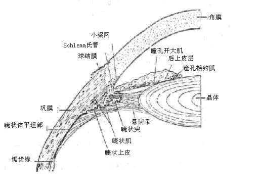 眼球前部的后面观 贴附于巩膜内面,前接虹膜根部,后与脉络膜相连,是葡萄膜中间部分。宽约6--6.5mm。睫状体分为两部分;前1/3宽约2mm较肥厚称睫状冠,其内侧面有70--80个纵行放射状突起叫睫状突,主要功能是产生房水。后2/3宽约4--4. 5mm,薄而平坦称睫状体平坦部(或睫状环)。从睫状体至晶状体赤道部有纤细的晶体悬韧带与晶体联系。睫状体内有睫状肌,与虹膜中的瞳孔括约肌、瞳孔扩大肌统称为眼内肌。组织学上睫状体从外向内主要由睫状体棕黑板、睫状肌、睫状上皮细胞等构成。睫状肌含有三种平滑肌纤维,即纵行肌纤维、放射状肌纤维和环行肌纤维。 睫状体的生理特点是:(1)睫状突的上皮细胞产生房水,与眼压及眼球内部组织营养代谢有关。(2)调节 晶状体的屈光力。当睫状肌收缩时(主要是环行肌),悬韧带松驰,晶体借助于本身的弹性变凸,屈光力增加,可看清近处的物体。(3)睫状体也富有三叉神经末梢,在炎症时,眼疼明显。 返回 3.脉络膜(choroid ) 脉络膜包围整个眼球的后部,前起于锯齿缘,和睫状体扁平部相连,后止于视盘周围。脉络膜和巩膜联系疏松,二者之间存有潜在性间隙叫脉络膜上腔;但和视网膜色素上皮层则连接紧密。 组织结构上由外向内主要分: