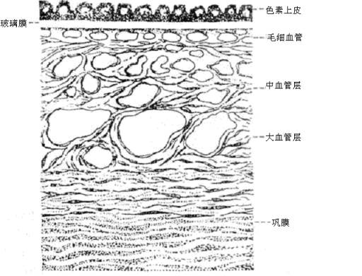 (三)内层,视网膜(retina) 是一层透明的薄膜,前部止于锯齿缘,后部到视盘。视网膜是由色素上皮层和视网膜感觉层组成,两层间在病理情况下可分开,称为视网膜脱离。 脉络膜切面 1.视网膜色素上皮层:此层与脉络膜的玻璃膜紧密相连,是由排列整齐的单层六角形柱状色素上皮细胞组成。这些细胞具有皱褶的基底膜、胞体,细胞顶部的黑色素粒和微绒毛。相邻的细胞间有连接复合体,其紧密连接构成血-视网膜外屏障。 视网膜色素上皮层的主要作用为(1)支持光感受器细胞,贮存并传递视觉活动必需的物质如维生素A。(2)吞噬、消化光感受器外节 盘膜以及视网膜代谢产生的一些物质。(3)作为血-视网膜外屏障,维持视网膜内环境的稳定。(4)从脉络膜毛细血管输送营养给视网膜外层。(5)遮光、散热作用。(6)再生和修复作用等。视网膜色素上皮细胞的异常总是引起光感受器细胞的病变及坏死。 2.感觉部视网膜: 组织学上,视网膜由外向内可分10层,依次为: