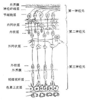 外层 1.视网膜色素上皮层 内层 2.视杆及视锥 第一神经元 3.外界膜 4.外核层 5.外网状层 第二神经元 6.内核层 7.内网状层 8.神经节 细胞层 第三神经元 9.神经纤维层 10.内界膜 感觉部视网膜由三级神经元、神经胶质细胞和血管组成。最外层为第一神经元,称光感受器细胞(photoreepter cells),是接受、转变光刺激的神经上皮细胞。细胞有两种:一种是锥细胞,主要集中在黄斑区,有辨色作用,能感受强光,司明视觉,有精细辨别力,形成中心视力。一种是杆细胞,分布在黄斑区以外的视网膜,无辨色功能,感受弱光,司暗视觉,形成周边视力(视野)。居于内层的为第三级神经元是传导神经冲动的神经节 细胞,其轴突汇集一起形成视神经。第二级神经元为双极细胞,位于第一、第三级神经元之间,起联络作用。 视网膜组织示意图