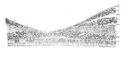 黄斑中心凹切面图 黄斑中心凹高倍图(左半)和神经元联系示意图(右半)