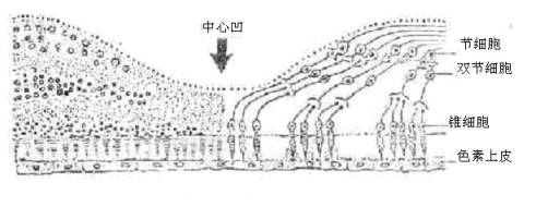 光感受器细胞受光射,接受刺激后其中的视色素发生化学变化产生膜电位改变,并形成神经冲动通过双极细胞传到神经节 细胞,最后通过视神经沿视路终达大脑枕叶视觉中枢产生视觉。 光感受器细胞(锥细胞和杆细胞)的超微结构包括外节 、内节 、连接纤毛、体部和突触。在生理功能上,外节 居重要地位。外节 由许多扁平膜盘堆积组成,约含700个。外节 的外周为浆膜所围绕。锥细胞外段呈圆锥形,其膜盘与浆膜连续,膜盘含有三种与色觉相应的视色素。杆细胞外节 则为圆柱形,膜盘与浆膜分离,膜盘内充满视紫红质,为感光色素。膜盘脱落与光刺激有关,其吞噬则由视网膜色素上皮完成。 光 感受器细胞的光化学反应过程,目前对杆细胞研究的比较清楚,在杆细胞外节 中含有视紫红质,由维生素A醛和视蛋白相结合而成。在光的作用下,视紫红质退色、分解为全反-视黄醛和视蛋白。在视黄醛还原酶和辅酶I的作用下,全反-视黄醛又还原为无活性的全反-维生素A,并经血流入肝脏,再转变为顺-维生素A。顺-维生素A再经血入眼内,经视黄醛还原酶和辅酶I的氧化作用,成为有活性的顺-视黄醛,在暗处再与视蛋白合成视紫红质。在暗处视紫红质的再合成,能提高视网膜对弱光线的敏感性。在上述光化学反应中,如果缺乏维生素A等,就会导致视紫红质再合成发生障碍,引起暗适应功能降低或消失,于是在弱光线下(晚上),看不见东西,临床上称夜盲症。 已知锥细胞中含有视紫蓝质、视紫质、视青质,也是由一种维生素A醛及视蛋白结合而成,是锥细胞感光功能的物质基础,与明视觉和色觉有关。但其光化学反应比较复杂,尚没有充分得以阐明。 视盘(optic disc),也称视乳头,位于眼球后极稍偏鼻侧,直径约1. 5mm,是视神经纤维汇集穿出眼球的部位。其中央呈漏斗状,称生理凹陷,其形状、大小、位置、深度因人而异。视盘无感光细胞、故无视觉。所以在正常视野中存在一个盲点叫生理盲点。视盘有丰富的血管所以呈淡红色。 黄斑(macula lutea ),视网膜内面正对视轴处,距视盘约3~4mm的颞侧稍偏下方,有一椭圆形凹陷区称黄斑。其直径约1~3mm,为锥细胞集中处。黄斑区没有视网膜血管,此区营养主要依靠脉络膜毛细血管层供应。该区中央有一凹称中心凹,此处视网膜最薄,只有锥细胞,视网膜的其它各层均向旁侧散开,呈斜坡状。光线到达中心凹时能直接照射到锥细胞上,是中心视力最敏锐之处。黄斑区以外的视网膜司周边视力.由于黄斑至视盘的神经纤维称盘斑束呈弧形分布,约为视神经所含全部纤维一半,从而保证了黄斑的生理功能需要。