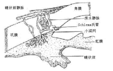 锯齿缘(ora serrata ),为视网膜感觉部前端的终止处,距角巩膜缘约6 .6~7.9mm,眼杯之潜在间隙在此处吻合闭锁。二、眼内容物 包括房水、晶状体和玻璃体。通常与角膜一起统称为眼的屈光间质。特点是透明、无血管、具有一定的屈光指数,保证光线通过。 (一)房水(agueous humor):在角膜后面与虹膜和晶体前面之间的空隙叫前房,中央部深约2.5~3mm,其周围部称前房角。在虹膜后面,睫状体和晶状体赤道部之间的环形间隙叫后房。充满前、后房的透明液体叫房水。房水由睫状突上皮细胞产生,总量约为0.25~0.3ml。主要成分为水,含有少量氯化物、蛋白质、维生素C 、尿素及无机盐类等,房水呈弱硷性,比重较水略高。 房水的主要功能是:(1)供给眼内组织,尤其是角膜、晶状体的营养和氧气,并排出其新陈代谢产物。(2)维持眼内压。房水的产生和排出与眼内压关系密切,正常时两者处于平衡状态。当某种因素使平衡失调,可导致眼压的增高或降低,对眼组织和视功能造成障碍。(3)是屈光间质之一,具有屈光作用,屈光指数为1.3336。 房水产生和排出主要途:径 前房角的解剖与房水流出途径 房水出路