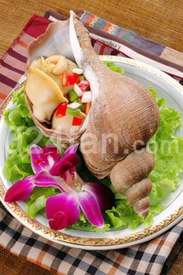 选料: 海螺肉350克,料酒、精盐、味精、酱油、醋、姜块、葱段、花椒、香油、清汤各适量。 制法: 1、 将海螺肉反复揉搓洗净,从海螺肉缺口处剖成相连的两片,用刀拍平,在两面剞上斜花刀,再从中间切开。姜一半切末,一半拍松,用酱油、醋、精盐、姜末调成姜味汁。 2、 海螺肉放盘内,加料酒、味精、葱段、姜块、花椒和清汤,上笼蒸15分钟左右取出,拣去姜、葱、花椒不要,淋入香油。另配姜味汁一碟食用。 特点: 肉质鲜美,脆嫩可口。 功效: 海螺肉含有丰富的蛋白质、脂肪、多种矿物质、多种维生素,其性味甘凉、无毒,具有清热明目的功效。