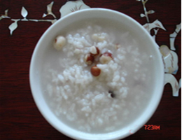 将芡实、龙眼肉与糯米同煮粥。此粥又称"飞扬粥"。每日空腹服1-2次。