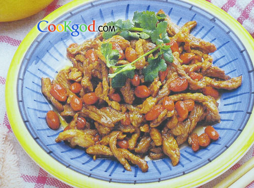 材料与做法:枸杞100克,猪瘦肉300克,青笋(或玉兰片)10克,猪油100克,各种佐料适量。将猪瘦肉洗净,切成6厘米左右的细丝,青笋也同样制作,枸杞子洗净。待油七成热时,下入肉丝、笋丝煸炒,加入料酒、酱油、食盐、味精,放入枸杞,翻炒几下,淋人麻油即可。