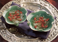 [原料]:鸡肝100克,水发银耳15克,枸杞子5克,茉莉花24朵。 [制法]:将鸡肝洗净切片,放入碗中,加湿淀粉、料酒、姜汁、盐备用。将汤锅置火上,放入鸡汤,加入料酒、姜汁、盐和味精,随即入银耳、枸杞、鸡肝煮沸,去浮沫,待鸡肝刚熟,撒入茉莉花,装碗即成。