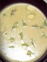 菜 名: 芦笋忌廉汤 主 料: 芦笋5两(约200克),西芹片、洋葱丝各2两(约80克),烟肉2条,清鸡汤4杯,鲜忌廉4汤匙,香叶1片,牛油2茶匙,葱、青蒜、盐、胡椒粉各少许。 做 法: 1、各物洗净,烟肉切丝,芦笋切片,葱、蒜切碎。 2、牛油烧化,将烟肉、芦笋、西芹、洋葱炒香,加适量清水,上盖,用文火焖火局10分钟。 3、炒匀芦笋等,加入清鸡汤、香叶,用文火煮10分钟,不时搅拌,取去香叶,放搅拌机内磨成蓉汤,取出再煮沸,加盐、胡椒粉调味,熄火后拌入鲜忌廉,撒上葱蒜即可。 备 注: 如怕肥腻,可免去烟肉料。 功 效: 明目补肝,顺气活血,美容养眼,止咳补肾。