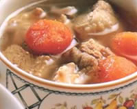 菜 名: 牛骨枸杞胡萝卜汤 主 料: 牛骨头250克,枸杞子50克,胡萝卜150克。 做 法: 将牛骨头砸碎,胡萝卜洗净切块,枸杞子洗净,同置锅中加水适量,文火煮,使骨髓充分溶解于汤中,酌加少许姜、鱼露、味精,调味即可,饮汤吃枸杞子、胡萝卜。此方可作为家庭便菜。 药用价值: 填精益髓,养血荣发,明目补肝,用于精血亏虚所致的头发易裂易断易脱。