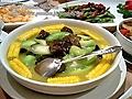 菜 名:鲜美丝瓜腐竹汤 基本材料 : 丝瓜两条,腐竹2根,两调匙精制油,酒、盐、味精,鸡汤,肉汤 做 法:取丝瓜两条去皮,尽量保留绿色内皮,切开除去瓜心,将丝瓜切成块状,用清水烧煮三分钟捞出。腐竹在热水中浸泡4分钟。然后,在炒锅内倒两调匙精制油,等油热后将腐竹和丝瓜倒进锅内略炒,再放入少量酒、盐、味精,如有鸡汤或肉汤,则再放入一些,烧煮五分钟后,即可上桌食用。 另外,丝瓜嫩叶也可以烧汤吃。丝瓜叶汤不仅同样具有清热解毒作用,而且对夏天易患皮肤病和去疔疮的人,还具有很好的食疗作用。 特 点 : 味道鲜美,不油腻, 功 效:清火、解毒、化痰、止喘、明目、通便、消水肿。
