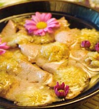 菊花猪肝汤 原料:猪肝100克,鲜菊花12朵,油、盐、酒适量 做法:猪肝洗净,切薄片,用油、酒腌10分钟;鲜菊花洗净,取花瓣。先将菊花放入清水锅内煮片刻,再放猪肝,煮20分钟调味即成。有滋养肝血,养颜明目功效。