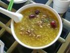 取新鲜荷叶一片,洗净切碎,放入纱布袋中水煎,取浓汁150毫升,加入粳米100克,冰糖适量,加水500毫升,煮成稀粥,每天早、晚食一次。荷叶气香微涩,有清热解暑、消烦止渴、益气明目、降低血压和减肥等功效,与粳米、冰糖煮粥香甜爽口,是极好的清热解暑良药。