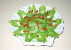 选 料:苦瓜200克,鸡蛋2个,精盐、味精、植物油各适量。 制 法: 1、将苦瓜顺着中间剖开,去瓤洗净,切成薄片。鸡蛋磕入碗内,放精盐,搅打均匀。 2、锅上火,放入植物油烧热,下入苦瓜片,炒熟。原锅中加油烧热,倒入鸡蛋液、苦瓜片,用勺推匀,炒至蛋熟,放入味精。精盐即可出锅。 特 点:蛋嫩,瓜熟,味鲜微苦。 功 效:苦瓜含奎宁、蛋白质、脂肪、糖类及丰富的维生素C、维生素B1、维生素B2、钙、磷、铁等。《本草纲目》说,苦瓜“除邪热,解劳乏,清心明目”。鸡蛋营养丰富,富含维生素A、维生素B1等。苦瓜与鸡蛋相配成菜,对保护眼睛有利,可减少眼疾的发生。