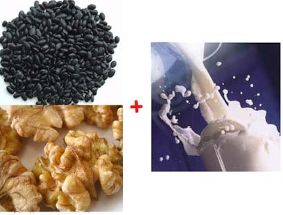 黑豆核桃冲牛奶: 原料:黑豆粉1匙,核桃仁泥1匙,牛奶1包,蜂蜜1匙。 做法:将黑豆500克,炒熟后待冷,磨成粉。核桃仁500克,炒微焦去衣,待冷后捣如泥。取以上两种食品各1匙,冲入煮沸过的牛奶1杯后加入蜂蜜1匙; 每天早晨或早餐后服用,或与早点共进。黑豆含有丰富的蛋白质与维生素B1等,营养价值高,又因黑色食物入肾,配合核桃仁,可增加补肾力量,再加上牛奶和蜂蜜,这些食物含有较多的维生素B1、钙、磷等,能增强眼内肌力,加强调节功能,改善眼疲劳的症状。