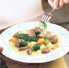 原料:牛肉丸250g、马铃薯200g、胡萝卜200g,洋葱半粒,大蒜4粒,青花菜150g,橄榄油2大匙,乳酪粉2大匙。 做法: 1、牛肉丸切半;洋葱切丁;马铃薯、胡萝卜成块状;青花菜切成小朵;大蒜切片备用。 2、加热橄榄油,炒香蒜片、洋葱丁。 3、将马铃薯及牛肉丸放入,小火焖煮5分钟。 4、将胡萝卜及青花菜加入,拌炒1分钟。 5、加乳酪粉及盐拌匀至浓稠状即可。 功效:牛肉在中医里有补脾胃、补血及强筋骨功效;乳酪含眼睛所需的维生素B2;青花菜、胡萝卜则是维生素A含量高的养眼蔬菜。这道菜味道香浓,深受小朋友喜爱。 营养分析:含热量401.6kcal、蛋白质15.3g、脂肪31.9g、醣类13.4g纤维11.1g、钙517mg、铁10mg、维生素C129mg。