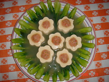 1、豆腐用模具制成花形,并将中间挖空待用。