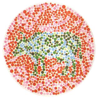 正常看应是一幅“牛”的图案,如看到的是一头“鹿”,就有可能是色盲或色弱。
