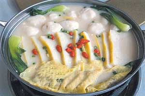 三鲜锅仔 推荐指数:★★★★★ 明目指针:鱼膏+鱼丸+蛋饺 鱼肉富含维生素,特别是维生素A、维生素D的含量更是其他肉类所不及的。由于鱼肉的化学组成与人体肌肉的化学组成十分接近,所以蛋白质中氨基酸含量也和人体接近。此外,海水鱼还含有碘质,对防止甲状腺肿大很有益处。换句话说,鱼的全身都是宝。 菜式解析: 三鲜锅仔中的鱼肉选用颇为讲究,取湖北洪湖大鲩鱼之多汁鲜肉,制作时先将鱼肉绞碎,加入少量盐、胡椒和味精,再与超级生粉一起拌匀,使其肉感更显筋道,而后同蒸约20分钟至乳白色块状,分切即成鱼膏;鱼丸制作方法与鱼膏接近,不同在于拌生粉时应多加点水,挤丸时以冷水下锅,煮熟以浮起为度。 蛋饺的制作与饺子相近,鸡蛋打碎下锅即可平整为蛋皮备用,取碎肉与葱花、盐等拌匀为馅,包入蛋皮。最后是高汤的制作,取鱼骨、鱼肉下锅熬40分钟至乳白色,加入鱼膏、鱼丸和蛋饺,煮沸即可。吃起来咸香味浓,口感润滑。