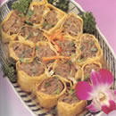 菜 名: 腐皮牛肉卷 主 料: 腐皮1张,碎牛肉6两(约240克),马蹄4个,葱粒1汤匙。 配 料: 腌料:水2汤匙,生抽1汤匙,糖1/8茶匙,生粉1/2汤匙,麻油、胡椒粉各少许。 调味料:罐头上汤(或水)1/3杯,生抽1汤匙,糖1/2茶匙,生粉1/3茶匙,麻油、胡椒粉各少许。 做 法: 1、马蹄去皮洗净,沥干水拍碎。 2、牛肉加入马蹄碎、葱粒及腌料拌匀成馅料。 3、腐皮先用湿布揩抹干净,并剪去四周硬边,分成二份,分别涂上一层薄生粉,加馅料包卷成长筒状,收口向下放在碟上,隔沸水蒸八分钟拿出,切成三厘米长段,放回碟上。 4、烧热二汤匙油,拌匀调味汁料倒入煮滚,淋在牛肉卷面即成。 备 注: 将少许生粉涂在腐皮上,可粘紧牛肉,不易松脱。 功 效:明目健齿。