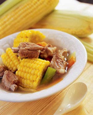 玉米萝卜排骨汤 玉米萝卜排骨汤清淡可口,营养丰富,在这样的天气喝喝也是不错的选择。 主料:排骨300克,胡萝卜300克,玉米2根。 辅料:生姜1小块,精盐2小匙,味精1小匙。 制法: 1.胡萝卜削皮,洗净切小块;玉米洗净切小块;生姜洗净拍松。 2.排骨洗净后砍成块,用开水汆烫。 3.砂锅内加适量水和排骨块、胡萝卜块、玉米块、生姜,煮开后改小火煲2小时。 4.加精盐、味精即可。 烹饪: 1.往排骨汤里加胡萝卜和玉米,可以减轻排骨汤的油腻感。 2.将骨头放入冷水中加热,这样可以延长蛋白质的凝固时间,使骨头中的鲜味慢慢渗入汤中,使汤格外鲜美。 3.在炖骨头汤时,加入少许食醋,使骨头中的钙质更容易溶出,有利于人体对钙的吸瞩,利用。 菜品营养: 1.玉米中的维生素B6、烟酸等成分,具有刺激胃肠蠕动、加速烘便排泄的特性,可防治便秘、肠炎、肠癌等。玉米富含维生素C等,有长寿、美容作用。玉米胚尖所含的营养物质有增强人体新陈代谢、调整神经系统功能。能起到使皮肤细嫩光滑,抑制、延缓皱纹产生作用。玉米有调中开胃及降血脂、降低血清胆固醇的功效。中美洲印第安人不易患高血压与他们主要食用玉米有关。 2.胡萝卜能提供丰富的维生素A,具有促进机体正常生长与繁殖、维持上皮组织、防止呼吸道感染与保持视力正常,治疗夜盲症和眼干燥症等功能。胡萝卜能增强人体免疫力,有抗癌作用,并可减轻癌症病人的化疗反应,对多种脏器有保护作用。妇女进食胡萝卜可以降低卵巢癌的发病率。胡萝卜内含玻珀酸钾,有助于防止血管硬化,降低胆固醇,对防治高血压有一定效果。胡萝卜素可清除致人衰老的自由基,除维生素A外,所含的B族维生素和维生素C等招牌营养素也有润皮肤,抗衰老的作用。它的芳香气味是挥发油造成的。能增进消化,并有杀菌作用。 3.猪排骨提供人体生理活动必需的优质蛋白质、脂肪,尤其是丰富的钙质可维护骨骼健康。