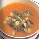 主 料: 南瓜9两(约360克),甘笋5两(约200克),青豆角3/2两(约60克),洋葱、马铃薯各1个,青瓜(黄瓜)半个,柠檬1/4个,清鸡汤5杯,芫荽、盐、胡椒粉各少许。