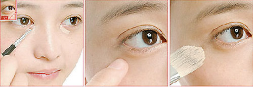 技巧一:用深浅不同的底妆来平衡肤色,隐藏眼袋。