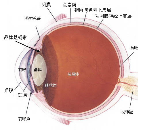 眼球壁主要分为外、中、内三层。外层由角膜、巩膜组成,眼球外层起维持眼球形状和保护眼内组织的作用。前1/6为透明的角膜,角膜是接受信息的最前哨入口。角膜是眼球前部的透明部分,光线经此射入眼球。其余5/6为白色的巩膜,俗称"眼白"。巩膜为致密的胶原纤维结构,不透明,呈乳白色,质地坚韧。 中层又称葡萄膜,色素膜,具有丰富的色素和血管,包括虹膜、睫状体和脉络膜三部分。虹膜:呈环圆形,在葡萄膜的最前部分,位于晶体前,中央有一2.5-4mm的圆孔,称瞳孔。睫状体前接虹膜根部,后接脉络膜,外侧为巩膜,内侧则通过悬韧带与晶体赤道部相连。脉络膜位于巩膜和视网膜之间。脉络膜的血循环营养视网膜外层,其含有的丰富色素起遮光暗房作用。