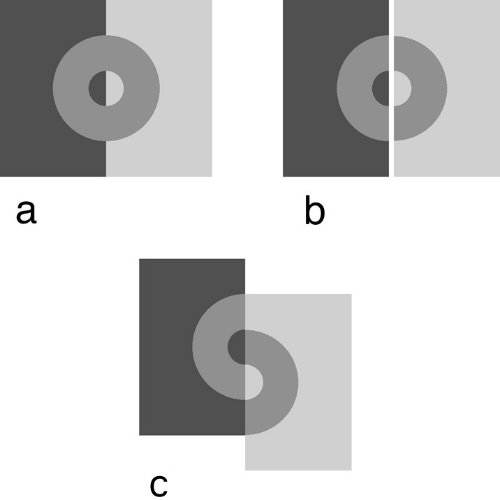 环左右两边的颜色一样(图a),错开以后右边就显得深一些(图c)。