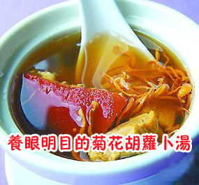 菊花性凉、味苦,入肺、肝、肾经,有清热解毒、凉血的作用,胡萝卜味甘、性平,入脾、胃、肺经。 原料:菊花6克,胡萝卜100克,葱花5克,食盐适量,味精2克,清汤适量,香油5克。