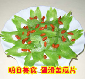 苦瓜含奎宁、蛋白质、脂肪、糖类及丰富的维生素C、维生素B1、维生素B2、钙、磷、铁等。《本草纲目》说,苦瓜“除邪热,解劳乏,清心明目”。鸡蛋营养丰富,富含维生素A、维生素B1等。苦瓜与鸡蛋相配成菜,对保护眼睛有利,可减少眼疾的发生。