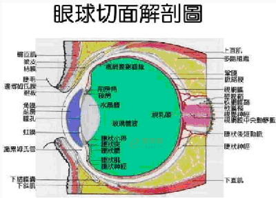 6. 睫状体:位于虹膜与脉络膜之间。睫状体可分泌水样液称为"房水"。房水可营养角膜,并维持眼球内的压力。睫状体可以调节水晶体的形状及厚度,以取得适当的焦距。