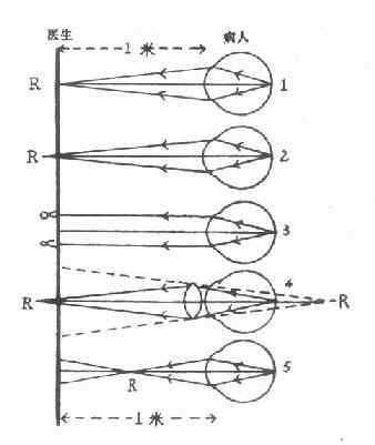 4.远视眼(插上凸球镜片远点由-R移到医生背后)