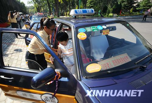 9月12日,一名社会志愿者把盲人朋友送到中国农业大学体育馆后搀扶盲人朋友下车。当日,20名盲人朋友来到中国农业大学体育馆“观看”北京残奥会坐式排球比赛,社会志愿者、北京出租车驾 驶员负责免费接送,20名社会志愿者充当盲人朋友的“眼睛”,把精彩的赛事讲解给他们听,让盲人朋友也能充分感受到残奥会的火热和志愿者的热情。