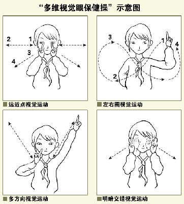 “多维视觉眼保健操”共分四节,分别为“远近点视觉运动”“左右圆线视觉运动”“多方向视觉运动”和“明暗交替视觉运动”。做操时,或双手食指竖起不停向前后上下左右方向伸出,或单手在眼前画8字,而眼睛始终盯着手指,随着手指的运动调整目光。