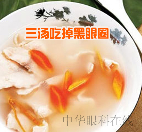 枸杞蜜枣汤 材料:枸杞子4钱、胡萝卜两条、龙眼肉4钱、鲜鸡蛋一只、猪肝6两、蜜枣两颗以及些许盐。 做法:将猪肝洗净切片下少许米酒腌一下,胡萝卜洗净去皮切块,鲜鸡蛋去壳搅拌后备用,把所有材料一起放入滚水中煮10分钟,再转小火慢炖两小时,最后加入蛋花,即可。 黄精美颜汤 功效:补益脾肾,改善黑眼圈。 材料:黄精30克、生地黄15克、瘦肉半斤、蜜枣3粒。 做法:用10碗水,放入所有材料煮滚10分钟后,再转小火煮两小时,即可享用。 养颜明目汤 功效:具有改善黑眼圈、眼袋浮肿、双目无神的功效。 材料:覆盆子3钱、女贞子3钱、枸杞子3钱、桂圆肉3钱、瘦猪肉3两、蜜枣两粒。 做法:把所有材料,加上12碗水,大火煮上10分钟,再转小火煮2小时,让材料完全释放出味道,即可饮用。