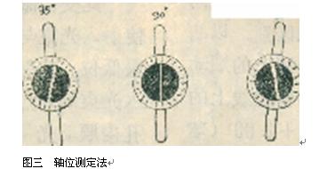 (1)常规法: 使用于散光度数在+0.75C~+1.OOC(圆柱镜)者。设受检眼属复式远视散光,水平经线上光带已被中和.垂直经线上呈顺动光带。为了精确测定散光的轴位.将套管置于最高位.光带置于垂直位90°经线上,食指稍稍旋动灯座管,由小孔观察瞳孔内顺动光带(图三)。发现在90°处显得最狭而亮, 与皮肤上光带并行。置在85°或95°时立刻出现三种现象即(1)与皮肤上光带不并行,(2)变宽(3)边界变模糊,从而确定轴位在90°而非85°或95°。