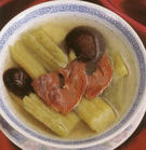 做法:各物分别洗净,温开水浸发冬笋、香菇,苦瓜去瓤和火腿均切薄片。苦瓜置沸水中稍滚片刻(即飞水)。起油镬爆香姜,下苦瓜稍炒片刻,加入清水1250毫升(5碗量)滚沸后下冬笋、香菇和火腿 调入适量食盐和麻油便可,此量可供3~4人用。