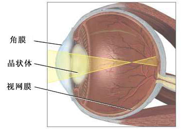 角膜是覆盖在有色的虹膜及瞳孔上的透明层。眼的角膜和晶状体都是使光线聚焦到视网膜从而产生视力的结构。