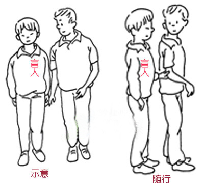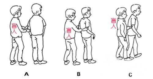 当引导者要带视力残疾者行走时,要先征得他的同意。然后,引导者与视力残疾者并排而立,引导者用靠近视力残疾者的手背,轻触其手背,视力残疾者被触及的手沿引导者的手臂上移至引导者的肘关节处,视力残疾者四指在引导者手臂的内侧,拇指在外侧,轻轻抓握引导者的肘关节。视力残疾者后退半步,站在引导者的后侧方,抓握的手臂的上臂与身体靠拢,与前臂成直角。当引导者迈步时,视力残疾者可根据抓握手的感觉跟随行进。