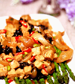 6、将焯好的芦笋码放在盘底,把出锅的海参豆腐倒上撒红椒丝即可。