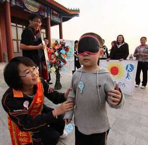 10月15日,“请您蒙上双眼用心去体会盲人的世界……”这是由天津市大学生发起的“点亮心灯,照亮盲路”国际盲人节宣传体验活动,在天津水上公园,来自医科大学检验系的学生志愿者们向过往游人发放“助残心灯”标志,鼓励大家在志愿者辅助下蒙眼行走,用心去感受盲人世界,以心比心点亮助盲助残的心灯。