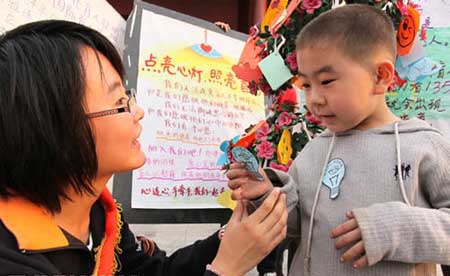 志愿者向一名小游客发放“助残心灯”标志。