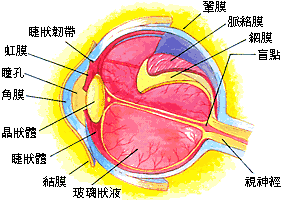 巩膜不透明,呈乳白色,质地坚韧。 中层具有丰富的色素和血管,包括虹膜、睫状体和脉络膜三部分。 虹膜:呈环圆形,位于晶状体前。不同种族人的虹膜颜色不同。中央有一2.5-4mm的圆孔,称瞳孔。睫状体前接虹膜根部,后接脉络膜,外侧为巩膜,内侧则通过悬韧带与晶状体相连。脉络膜位于巩膜和视网膜之间。脉络膜的血循环营养视网膜外层,其含有的丰富色素起遮光暗房作用。 内层为视网膜,是一层透明的膜,也是视觉形成的神经信息传递的最敏锐的区域。视网膜所得到的视觉信息,经视神经传送到大脑。 眼内容物包括房水、晶状体和玻璃体。 房水由睫状突产生,有营养角膜、晶体及玻璃体,维持眼压的作用。 晶状体为富有弹性的透明体,形如双凸透镜,位于虹膜、瞳孔之后、玻璃体之前。