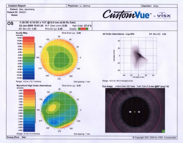 7、波前像差检查显示(如图):右眼残余高阶像差High Order 20.5%、Rms Error值0.78、Eff.Blur(D):1.98、暗室瞳孔直径8.4x8.0毫米、平均8.2毫米(见图二)。左眼残余高阶像差High Order 27.9%、Rms Error值0.81、Eff.Blur(D):1.62、暗室瞳孔直径7.6x7.4毫米、平均7.5毫米(见图三)。