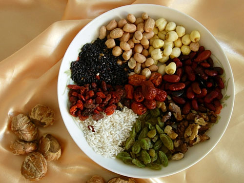 原料:大米50克,黄小米50克,粘黄米50克,糯米50克,秫米(粘高粱米)50克,红小豆100克,莲子100克,桂圆100克,花生米100克,栗子100克,小红枣100克,白糖适量。