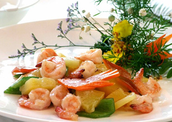 菠萝、甜蜜豆、咖喱粉、椰浆、黄油、大蒜、香葱、野生北极虾15只、胡萝卜、红辣椒、盐、白糖、鸡精。