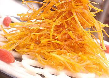 2、红薯去皮切细丝,放入油锅中炸成金黄色捞出;
