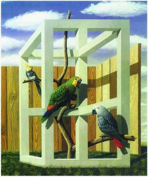 佛来芒斯艺术家琼斯.德.梅为这些鹦鹉创造了一个不可能存在的鸟笼