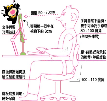 操作电脑的姿势与距离也是导致眼睛疲劳的原因,工作距离太近或姿势不正确,过度靠近电脑荧光幕,比较容易受到辐射线的伤害,尤其是使用笔记本电脑时,由于荧幕过小,导致使用者必须近距离工作,头部向前倾,颈部肌肉用力,形成工作劳累,加重眼睛的疲劳。有些电脑因使用时间过久,屏幕画质降低,清晰度减退,也会造成阅读上的困难。而工作环境的光线太强或者是太弱,都会引起屏幕与外界产生强烈的反应,对眼睛造成刺激。